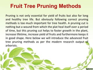 The document discusses essential methods for fruit tree pruning, emphasizing the importance of proper techniques for tree health and fruit yield. It introduces advanced pruning methods such as the collar method and branch bark ridge pruning, along with the importance of safely removing pruned branches and using appropriate tools. Additionally, the document highlights the detrimental effects of bad pruning cuts and the necessity of maintaining branch attachment for structural strength.