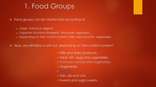 Fruits are characterized by being a good source of vitamins and minerals with high water content and low fat and protein. They can be classified by their origin as infructescences, simple fleshy fruits like berries and drupes, or complex fruits like pomes and pepos. Common fruit derivatives include nectars, juices, marmalades made from cooked fruit and sugar, and jellies made from fruit juice and large amounts of sugar. Experts recommend eating at least 3 pieces of fruit per day for their vitamin C content and dietary fiber.
