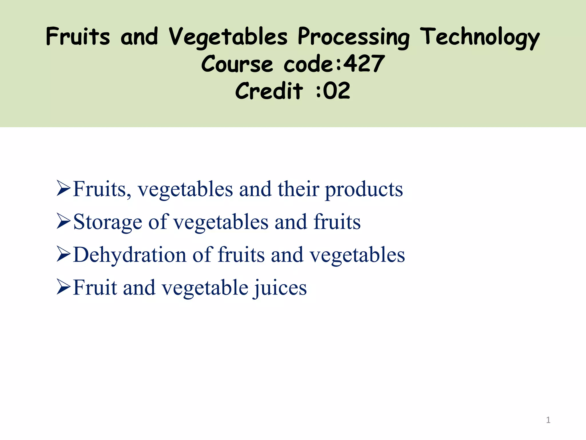 This document discusses fruits and vegetables processing technology. It covers topics like the objectives of fruit and vegetable processing, crop production statistics, general properties and classification of fruits and vegetables, their chemical composition, sources of color and color changes, post-harvest physiological changes, and factors that affect nutrient retention like pH, air, light, heat, and cooking. The overall goal of fruit and vegetable processing is to supply safe, nutritious food to consumers throughout the year.