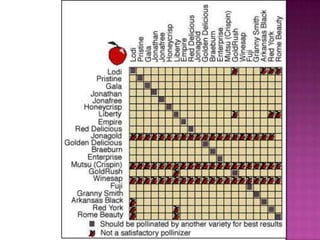 Apples can be categorized as dessert, processing, or storage varieties. Dessert apples are best eaten fresh while processing apples hold their shape well for cooking. Storage apples are bred to stay crisp and flavorful when refrigerated for months. Home gardens are best suited for dwarf or semi-dwarf trees that take up less space but produce more apples per square foot. Most apple varieties require another variety nearby for cross-pollination. Common pests like codling moth and apple maggot can be monitored and controlled through traps, removal of debris, and organic sprays.