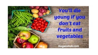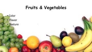 This document discusses fruits and vegetables. It describes vegetables as any part of a plant that is consumed for food, and classifies them according to the plant part used (roots, tubers, bulbs, seeds, stems, leaves, fruits, flowers) or chemical composition (carbohydrate-rich, protein-rich, fat-rich, high moisture content). It provides tips for selecting fresh vegetables in season without blemishes or decay, and preparing them by thoroughly inspecting, cutting as needed, cooking until tender-crisp, and serving immediately. Fruits are defined as fleshy, seed-containing plant products, and also classified in groups such as drupes, pomes, citrus fruit, berries,