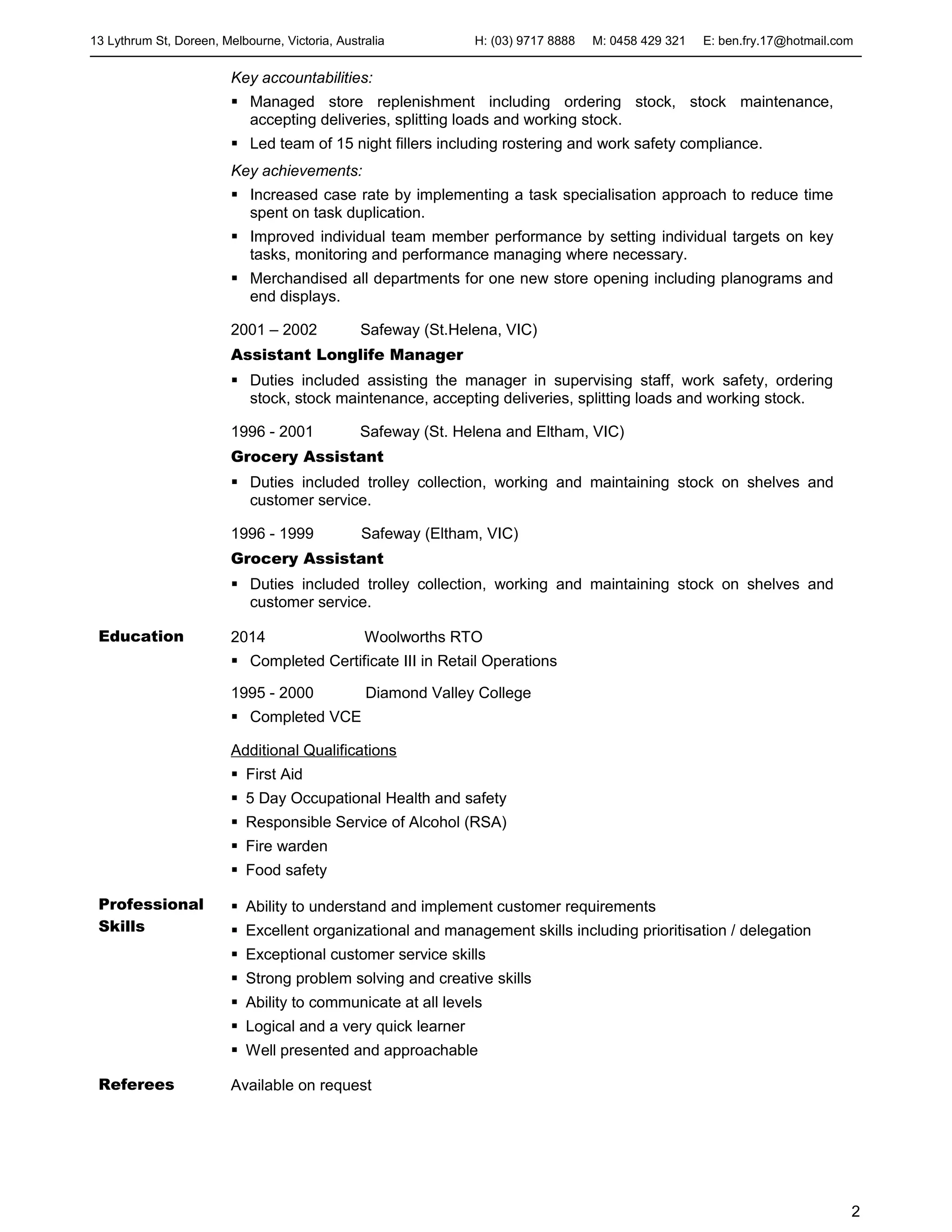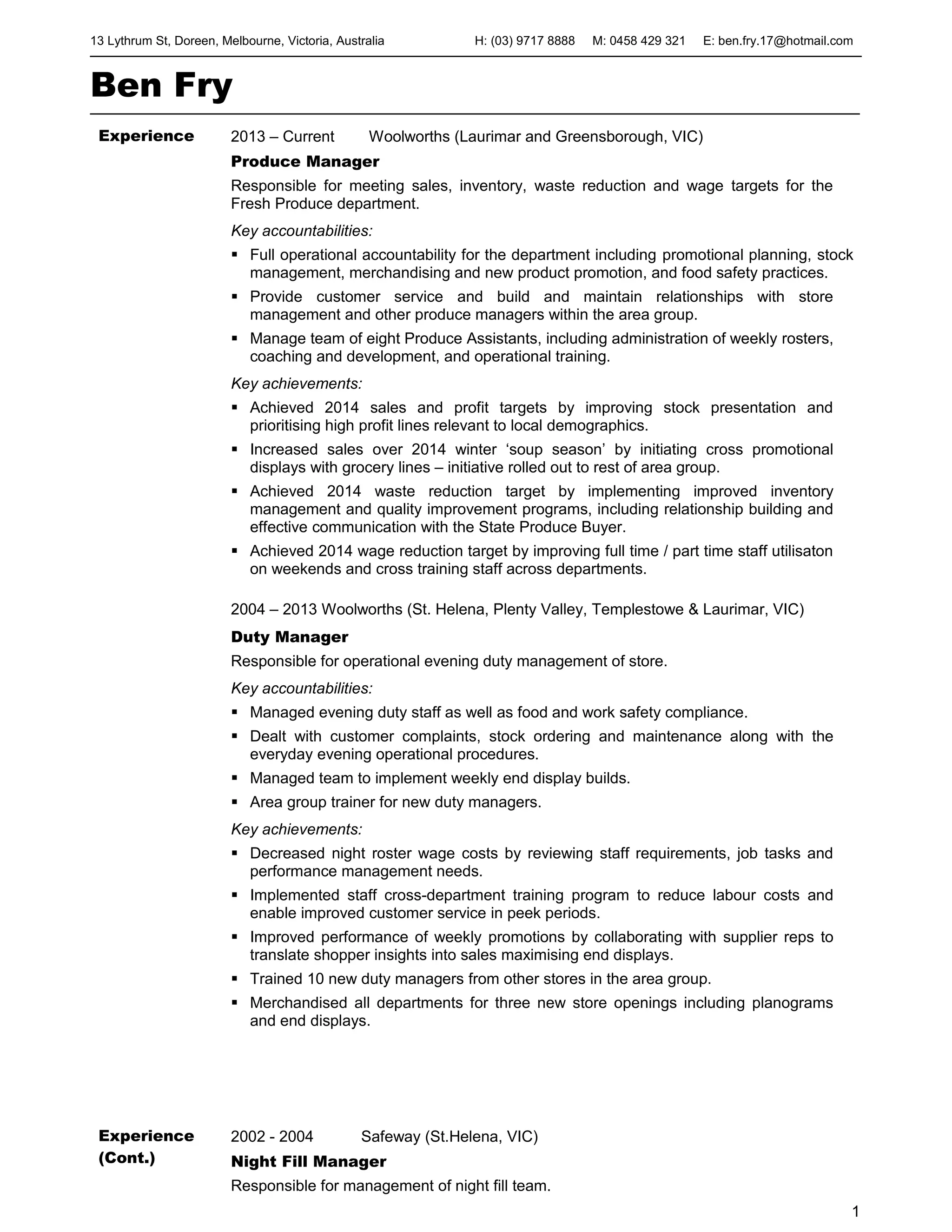 Ben Fry has over 20 years of experience in retail management roles with Woolworths and Safeway in Victoria, Australia. He is currently the Produce Manager at Woolworths in Laurimar and Greensborough, where he is responsible for meeting sales targets and managing a team of eight employees. Prior to this role, he held several management positions including Duty Manager, Night Fill Manager, and Assistant Longlife Manager.