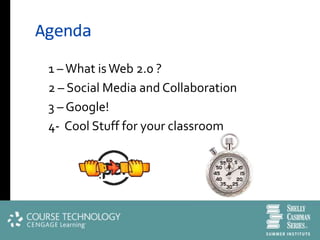 The document discusses Web 2.0 concepts and applications, highlighting its impact on collaborative learning, social media, and the evolution of the internet from static to dynamic content. It covers key principles of Web 2.0, tools for social networking and collaboration, and educational resources for implementing these technologies in the classroom. Additionally, it emphasizes user-generated content, tagging, and the significance of collaboration in Web 2.0 environments.