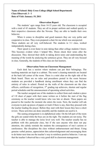 The document is an observation report detailing the classroom management and learning environment of a high school class with well-behaved students who show strong note-taking and analytical skills. It discusses effective classroom routines, teacher strategies for maintaining discipline, and the importance of a conducive learning environment. The report also includes reflections on future classroom organization, rules, and the involvement of students in rule-making to enhance their learning experience.