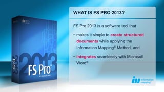 FS Pro 2013 is software that allows users to easily create structured documents using Information Mapping methods. It integrates with Microsoft Word and features templates, reusable content, branding customization, and validation tools to help users structure documents, ensure consistency, and save time. FS Pro 2013 is available with perpetual or yearly subscription licenses at introductory prices until February 18, 2013.
