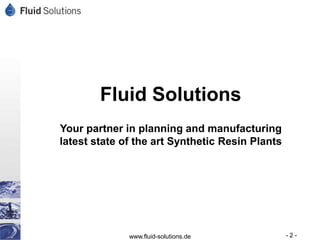 Fluid Solutions is a company that provides turnkey solutions for synthetic resin plants, including engineering design, procurement, installation, training, and consultancy. They have over 30 years of experience in supplying core equipment like reactors, condensers, piping, stirrers, and automation systems for resin production plants. Fluid Solutions prides itself on innovation and strives to provide environmentally friendly and efficient plant designs to help customers succeed.