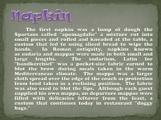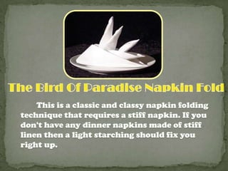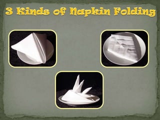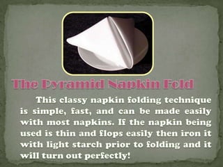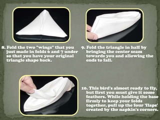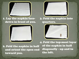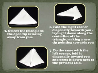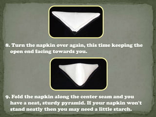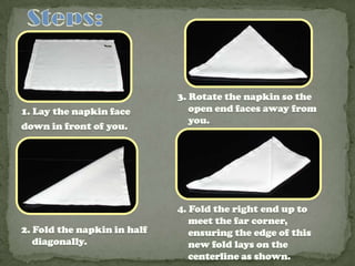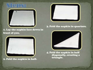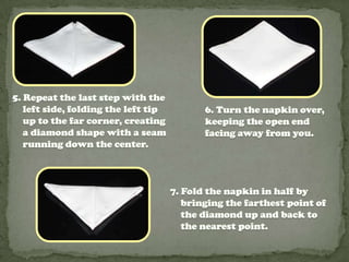 This document provides instructions for folding a napkin into a diamond shape in 8 steps. The instructions have the folder fold layers of the napkin diagonally up and to the left in a staggered formation, repeating the folds with subsequent layers. The final steps involve folding both sides of the napkin inward to create an even, staggered diamond pattern across the napkin surface.