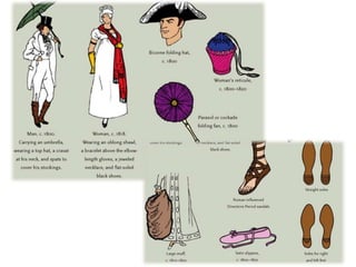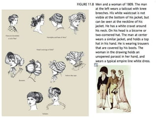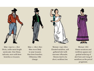 1) The document discusses fashion trends during the Directoire and Empire periods in late 18th century France and early 19th century England, including how men and women dressed.