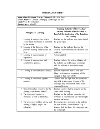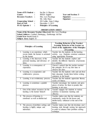 This document contains observation sheets from a field study student monitoring two teachers and how they apply the principles of learning in their classrooms. It notes that both teachers actively engaged students in hands-on activities and encouraged collaboration. While most principles were followed, the third principle of learning being a consequence of experience was not observed since it was the student's first visit. The student concluded that adhering to the principles leads to effective teaching and learning.