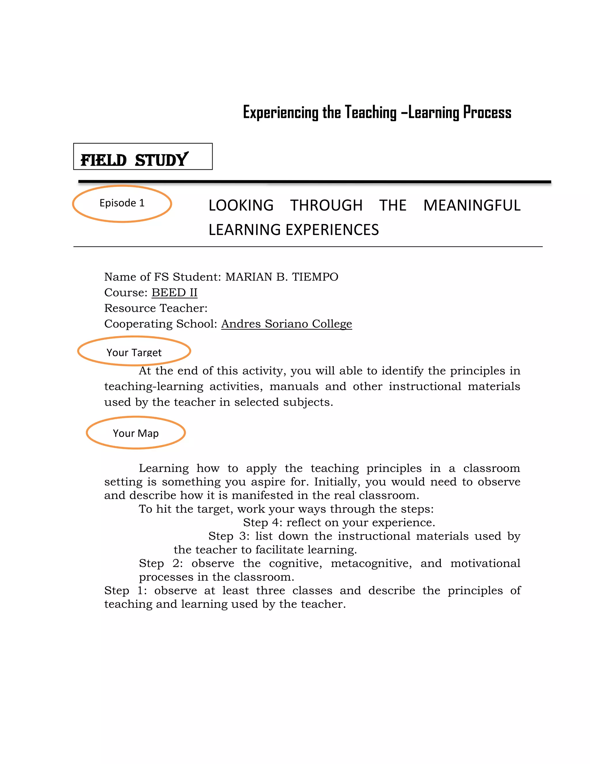 The document describes Marian B. Tiempo's observations of teaching and learning processes during field study experiences. It outlines 4 steps to the observation process: 1) observe classes and identify teaching principles; 2) observe teaching strategies and learner behaviors; 3) identify lesson objectives, activities, materials, and assessment; and 4) reflect on experiences. Marian documents observations of classes focusing on grammar and identifies principles like "practice makes perfect" and strategies like group work. Insights include the importance of teacher engagement and motivation to avoid boredom. Overall, the document outlines Marian's process of observing classroom instruction and reflecting on effective teaching.