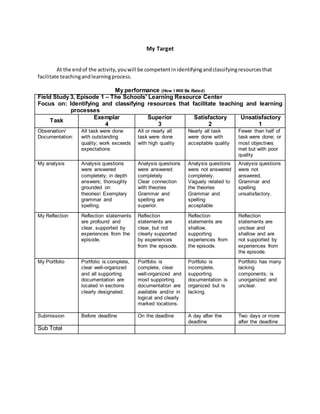 The document outlines the requirements and evaluation criteria for a field study activity where the student must visit the school's Learning Resource Center to identify and classify the resources available and how they facilitate teaching and learning. The student is evaluated on their ability to complete tasks such as observing the resources, analyzing how they are used, reflecting on their experiences, and compiling a portfolio of their work.