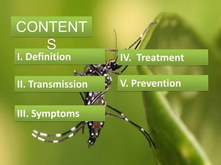 This document provides information about dengue fever, including its definition, transmission, symptoms, treatment, and prevention. It states that dengue is a mosquito-borne virus found in tropical and subtropical regions worldwide. The virus is transmitted by the bites of infected Aedes aegypti mosquitoes and has an incubation period of 4-10 days in humans. Common symptoms include high fever, headache, muscle pains, and rash. Treatment focuses on medical care and fluid maintenance to prevent complications. Prevention involves eliminating mosquito breeding sites and following government advisories.