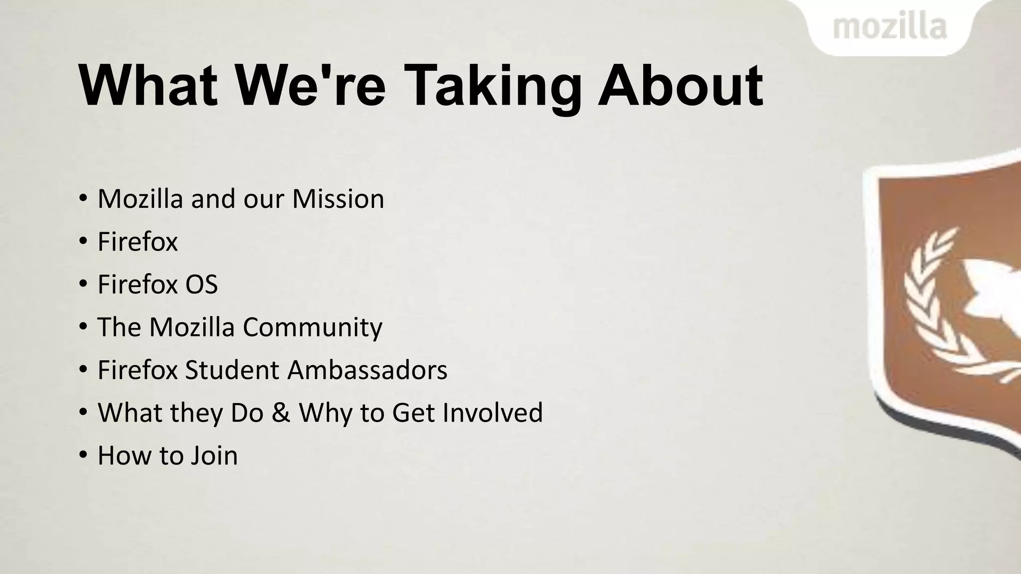 This document provides an overview of Mozilla and the Firefox Student Ambassadors program. It summarizes Mozilla's mission to promote openness on the web through the Firefox browser and Firefox OS. The 3 sentences describe Firefox as an open source, customizable, and secure browser. It then explains that the Firefox Student Ambassadors program allows students to promote Mozilla's products and mission on their campus, gain experience, and connect with other ambassadors around the world. Interested students over 18 can join the program by visiting the provided URL.
