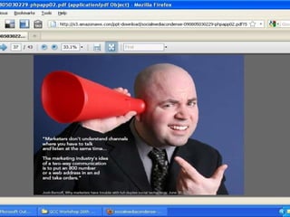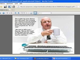 The document discusses developing a successful social media strategy for businesses. It recommends evaluating the social media landscape, conducting an internal readiness assessment, developing a strategic plan with objectives and key performance indicators, implementing the plan professionally, and ongoing monitoring and measurement of performance and return on investment. It emphasizes engaging customers through dialogue rather than one-way broadcasting to build relationships and leverage social media for business goals.
