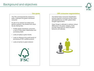 The FSC commissioned research to understand global mainstream consumers and their green habits, values, purchasing habits, and barriers to green behavior. The research used GfK's Green Gauge segmentation to classify over 9,000 respondents from 11 markets into 5 green segments based on their attitudes and behaviors. The research found that most consumers are concerned about environmental issues like pollution and climate change. At a global level, over 80% see these issues as serious problems. However, consumers' green actions vary, with behaviors like conserving energy and recycling being more common than activism. Most consumers believe their purchases can make an environmental difference and many intend to increase sustainable spending. However, barriers like cost prevent greener actions for some. Consumers hold