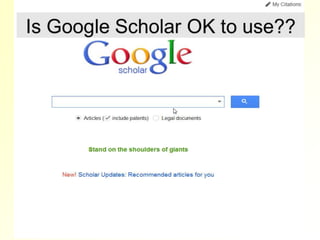 The document provides an overview of library resources and research strategies for students. It introduces the librarian, describes the library locations and services, and gives guidance on developing topics, searching for materials, evaluating sources, and avoiding plagiarism. Tips are provided on remote access, primary sources, subject guides, citation management, and getting research help from the librarian. The goal is to equip students with the skills and knowledge to effectively conduct academic research.