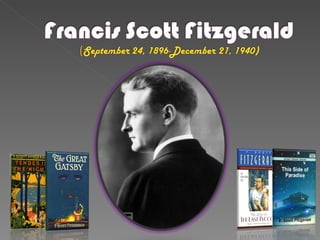 F. Scott Fitzgerald was an American novelist and short story writer. He is regarded as one of the greatest 20th century authors. Some of his most famous works include the novels This Side of Paradise, The Great Gatsby, and Tender is the Night. Fitzgerald's writing focused on themes of youth, relationships, and the American Dream through vivid and realistic portrayals of the Jazz Age in the 1920s. His writing style was clear and colorful, drawing more from storytelling than intellectualism or symbolism.