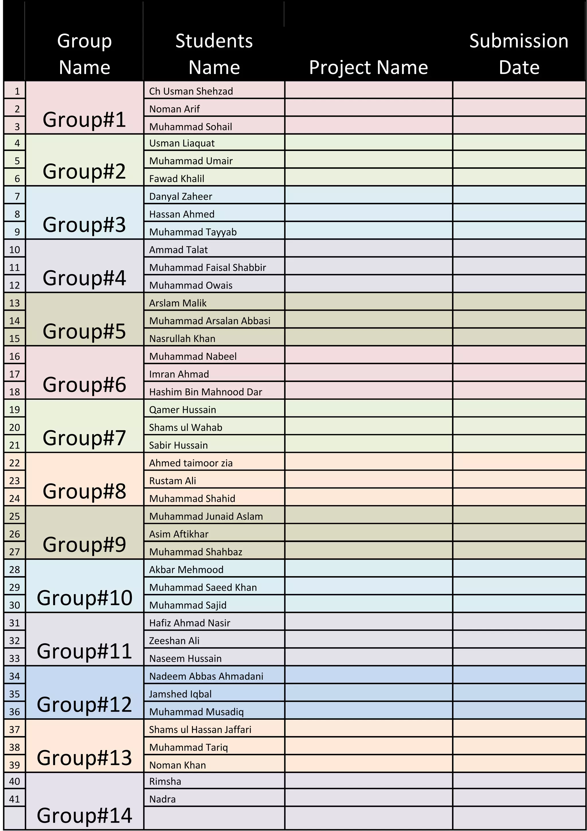 The document lists the names of 42 students divided into 14 groups. Each group has 3 students assigned to it. The students are working on projects, though the specific project names and submission dates are not provided.