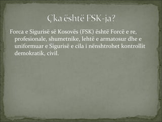 Forca e Sigurisësë Kosovës (FSK) është Forcë e re, profesionale, shumetnike, lehtë e armatosur dhe e uniformuar e Sigurisë e cila i nënshtrohet kontrollit demokratik, civil.