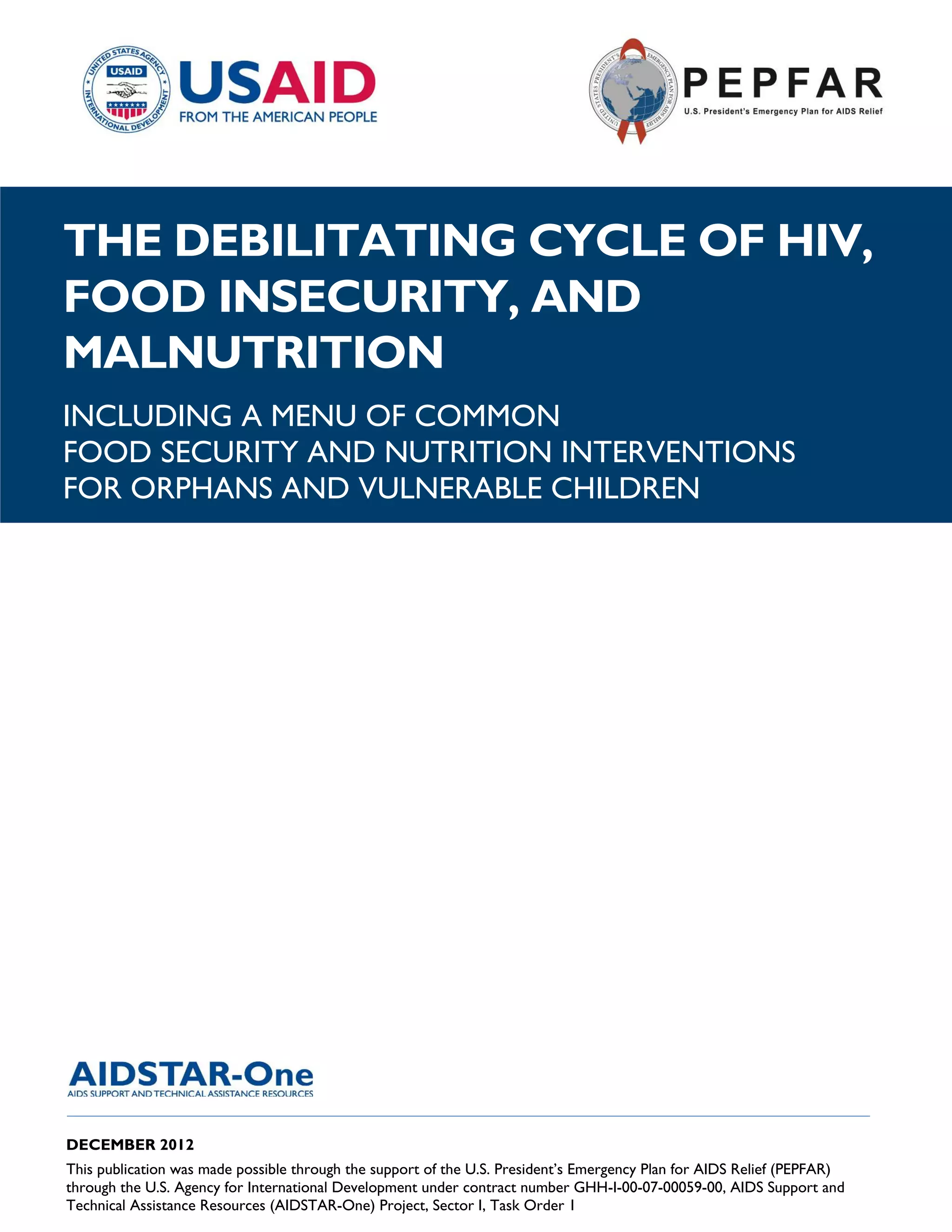 The document discusses the interconnected issues of HIV, food insecurity, and malnutrition affecting orphans and vulnerable children, highlighting how each factor exacerbates the other. It provides a menu of interventions categorized by age and stage to address these challenges, designed for development practitioners with some experience in HIV-related programming. The information serves as a guide for assessing the specific needs in various contexts to implement effective food security and nutrition interventions.
