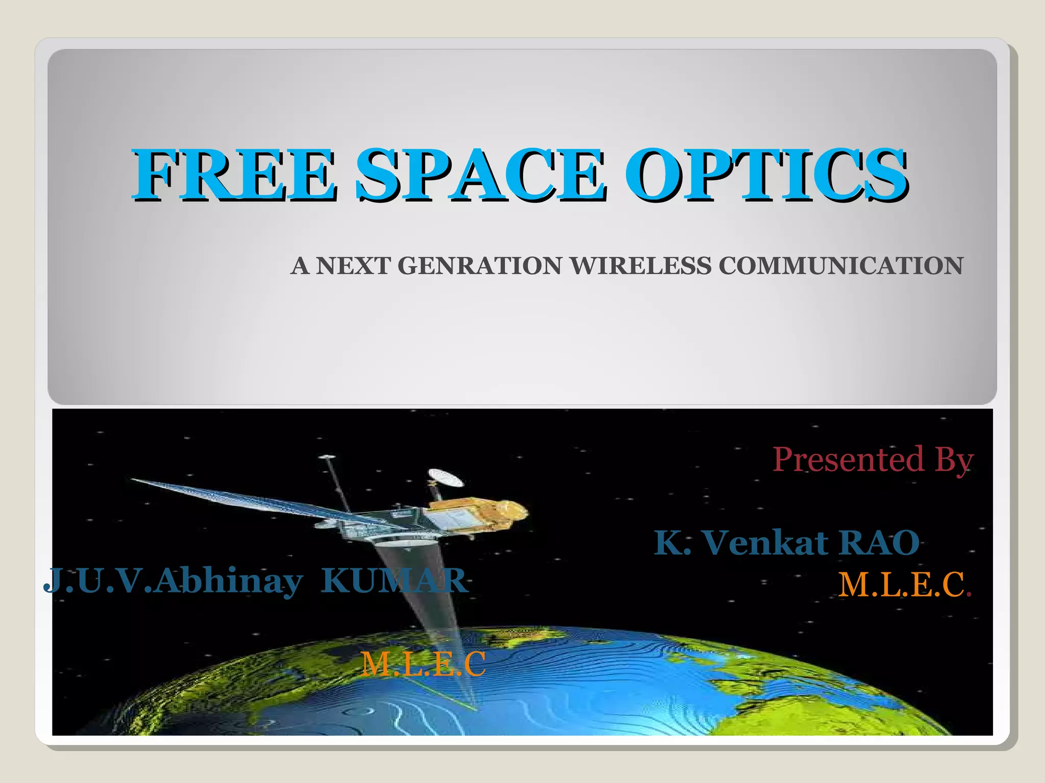 Free space optics is a wireless communication technique that uses infrared rays to transmit data, voice, and video through the air instead of optical fibers. It has several advantages over fiber, including easier scalability to ultra-high bandwidth and lower costs since conversion between optical and electrical signals is not needed at each node. However, free space optics also faces challenges from physical obstructions in the transmission path and atmospheric effects like beam wander and scintillation that can distort the infrared beam. Overall, free space optics allows for cost-effective, quick, reliable, and secure optical connectivity.
