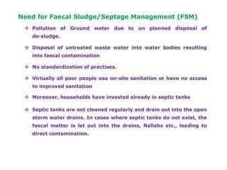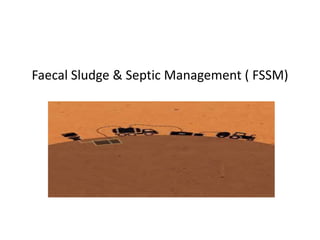 Faecal sludge and septage management (FSSM) refers to the safe collection, treatment, and disposal or reuse of faecal sludge from on-site sanitation systems, particularly in Bihar, where a significant population relies on septic tanks and pit latrines. The document discusses the technology of co-treatment at existing sewage treatment plants (STPs) as a low-cost solution for septage treatment and outlines various end-use methodologies such as soil conditioning, biogas production, and animal feed. Overall, FSSM aims to improve urban sanitation and promote beneficial reuse of waste in environmentally friendly ways.