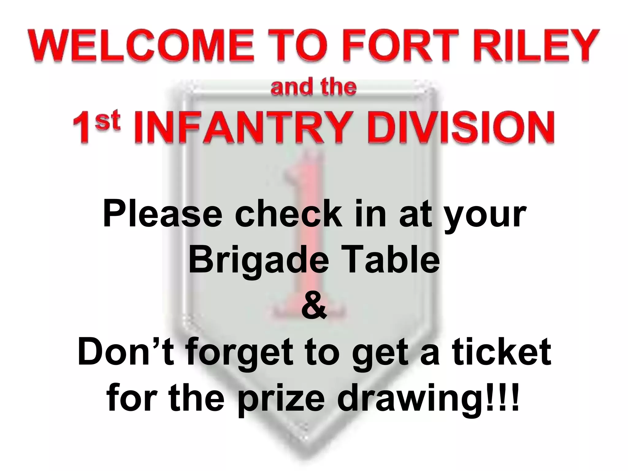 The document provides information about an upcoming event at Fort Riley. Attendees are asked to check in at the Brigade Table and get a ticket for a prize drawing. The event agenda lists various organizations that will be presenting, including those related to military savings, tax assistance, command updates, family services, housing, the commissary, and local community groups. Contact information is provided for each presenter.
