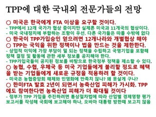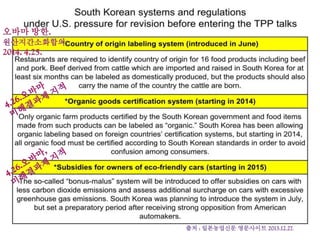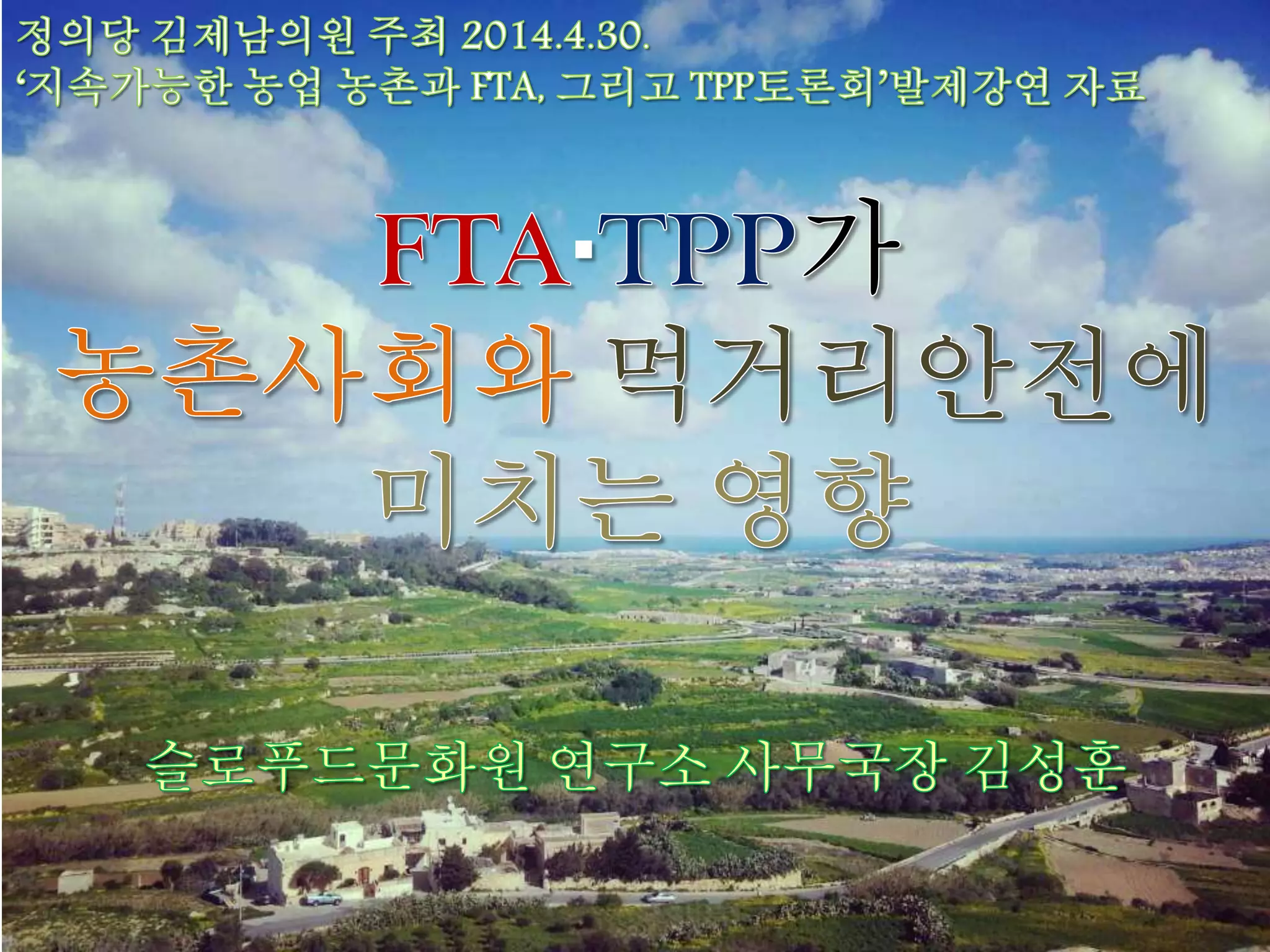 본격적인 TPP참여를 앞두고 지난 4월 1차협상에 이어 5월초에 한미 유기가공식품 상호동등성 2차 협상이 이뤄집니다. 이와 관련해 지난달 30일 정의당 김제남 의원실에서 개최한 지속가능한 농업농촌 FTA, 그리고 TPP 토론회에 다녀왔습니다. 많은 분들이 당일 발표자료를 요청하셔서 보완해서 아래에 첨부합니다. 아래 주소로 접속한 다음 다운로드해서 활용할 수 있도록 했습니다. 부족하나마 많은 활용있기를 바랍니다.