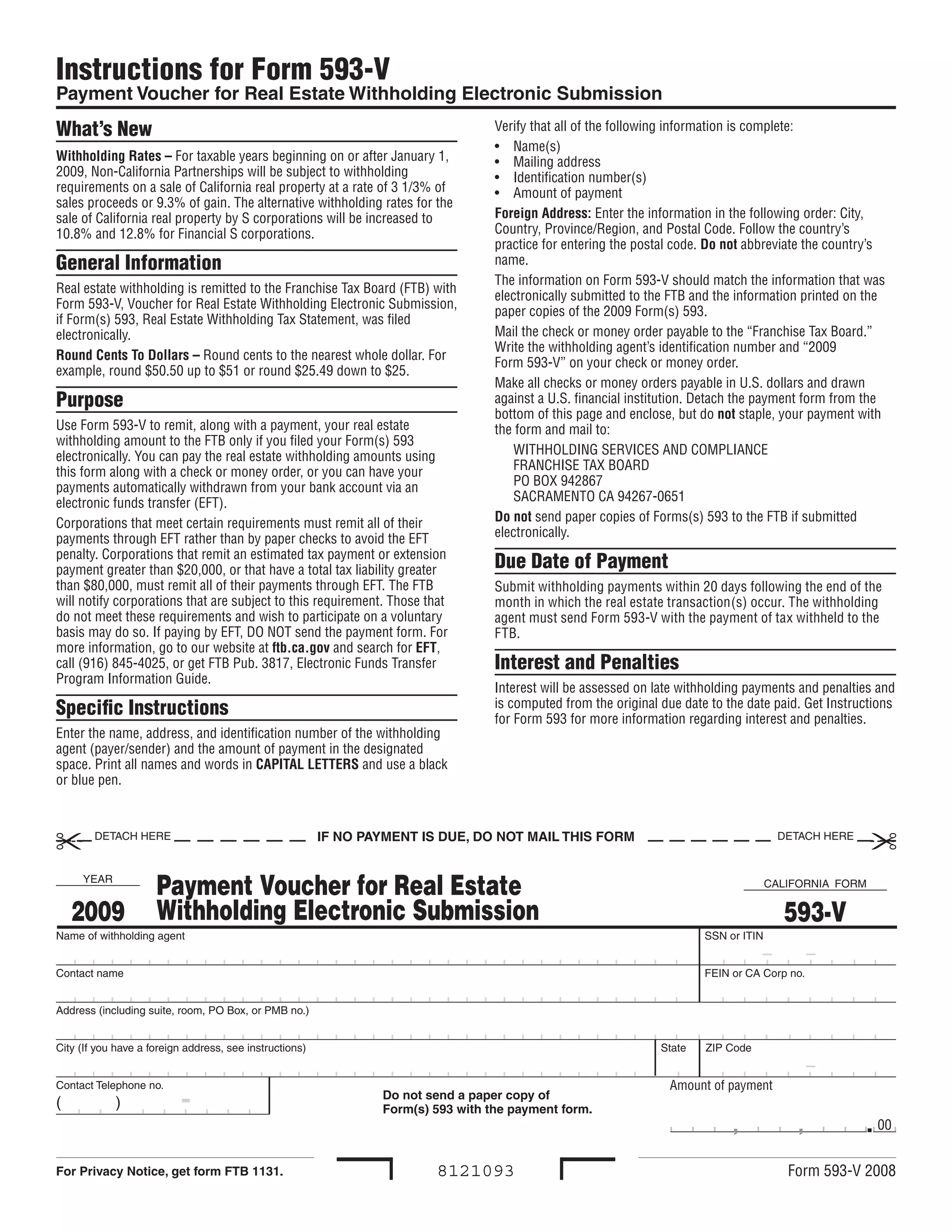 This document provides instructions for completing Form 593-V Payment Voucher for Real Estate Withholding Electronic Submission. Key details include: 1) Form 593-V is used to remit real estate withholding payment to the Franchise Tax Board if Form 593 was filed electronically. It must include the withholding agent's identifying information and payment amount. 2) Payments can be made by check or money order payable to the Franchise Tax Board, or through electronic funds transfer for large payments. The payment must match the electronically filed Form 593. 3) Payments are due within 20 days of the end of the month in which the real estate transaction occurred. Interest and penalties