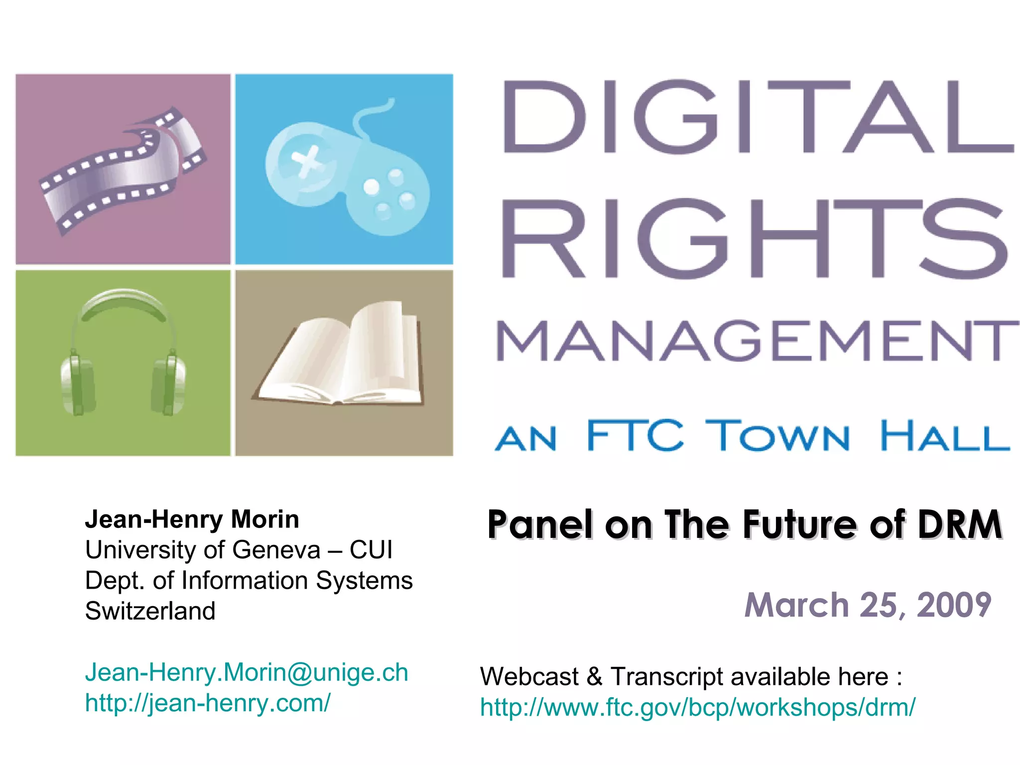 The document discusses the future and rethinking of Digital Rights Management (DRM), emphasizing the need for a user-centric approach and innovative business models. It argues for a transition from a security-focused mindset to one that reinstates user rights and encourages lawful use of copyrighted materials. The conclusion advocates for a collaborative redesign of DRM that considers all stakeholders and aims to balance copyright protections with user experience.