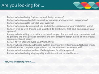 The document discusses Future Link for Technology (FTC) and the engineering solutions it provides. FTC has over nine years of experience in various industries. It prides itself on high standards of service, quality, management, and technology. FTC offers specialized solutions for telecommunications, including site design for telecom towers, FTTH installation, and Wi-Max installation. It also provides low current solutions such as data/telephone systems, MATV, master clock systems, security systems, fire alarm systems, and building management systems. FTC has multinational experience and provides trained, certified engineers and technicians.