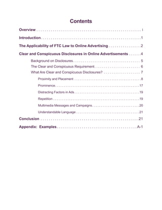 The FTC's 2013 guide outlines the requirements for clear and conspicuous disclosures in digital advertising to ensure they comply with consumer protection laws. It emphasizes the importance of proper placement, prominence, and clarity to prevent misinformation and deceptive practices in online advertising. The guide aims to help businesses develop effective ads while maintaining transparency and consumer trust in the digital marketplace.