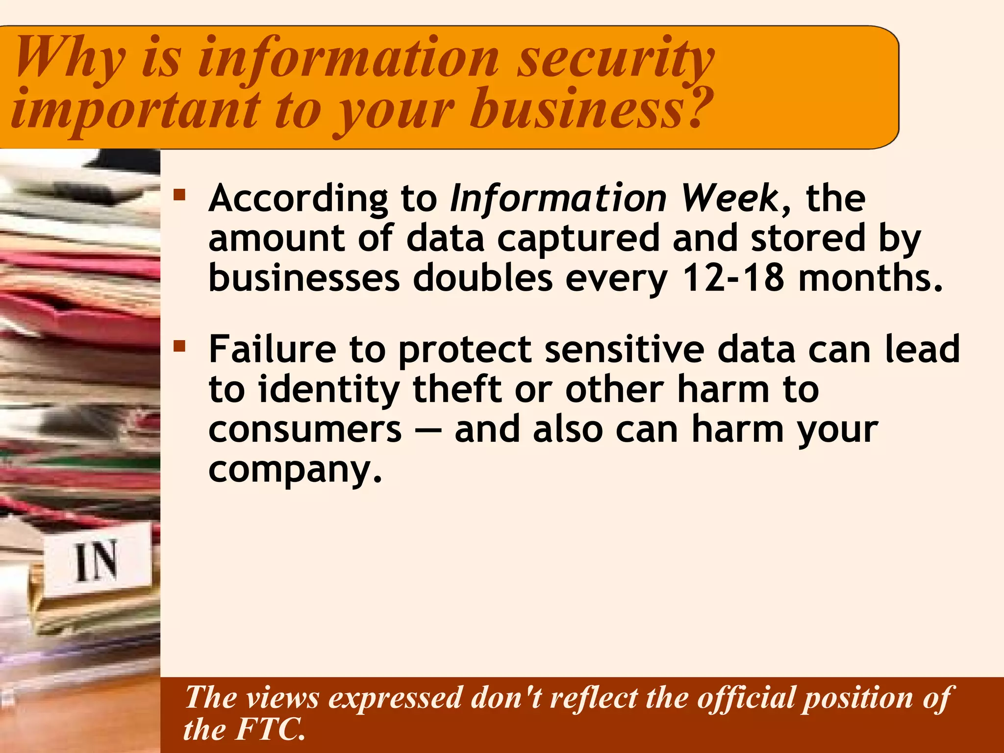 The document provides guidance for businesses on protecting personal information and complying with information security laws. It recommends that businesses take stock of the information they have, scale it down to only what is needed, lock or protect the information, properly dispose of what is no longer needed, and plan ahead for how to respond to security incidents. The document outlines key laws around information security and provides tips and resources for businesses.