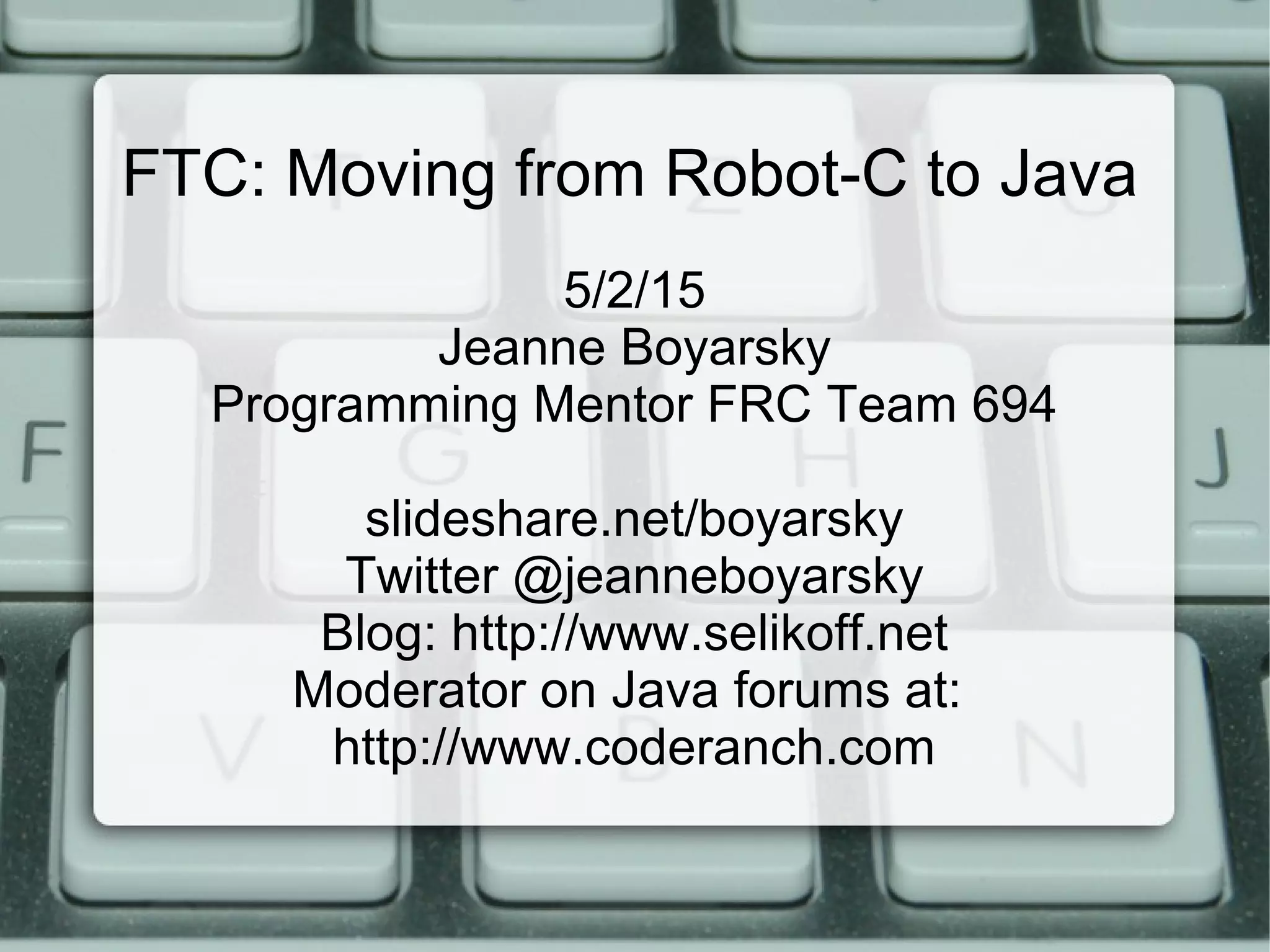 This document discusses moving from Robot-C to Java programming for FTC teams. It introduces Android Studio as the official IDE for Android development. It covers installing Android Studio and creating an Android and Java project. The document highlights some key differences between C/C++ and Java programming, such as garbage collection and no pointers in Java. It also provides recommendations for Java learning resources and forums for FTC programming questions.
