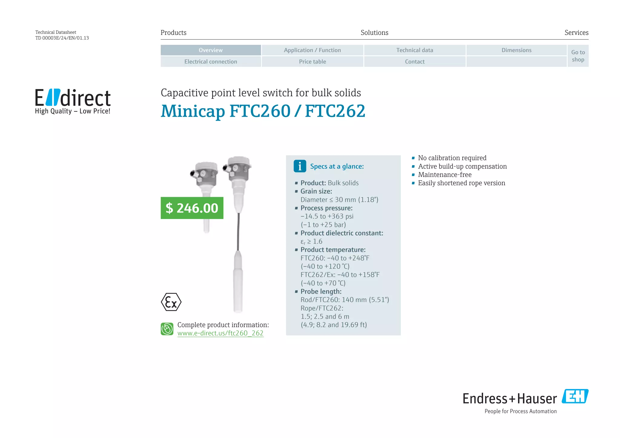 The document provides technical specifications for the Minicap FTC260 and FTC262 capacitive point level switches for bulk solids. Key details include the switches' output options of relay or PNP, operating temperature and pressure ranges, accuracy and hysteresis values. Application examples are given for various grains, minerals, plastics and their densities. Dimensions, electrical connections, and price tables are also included.