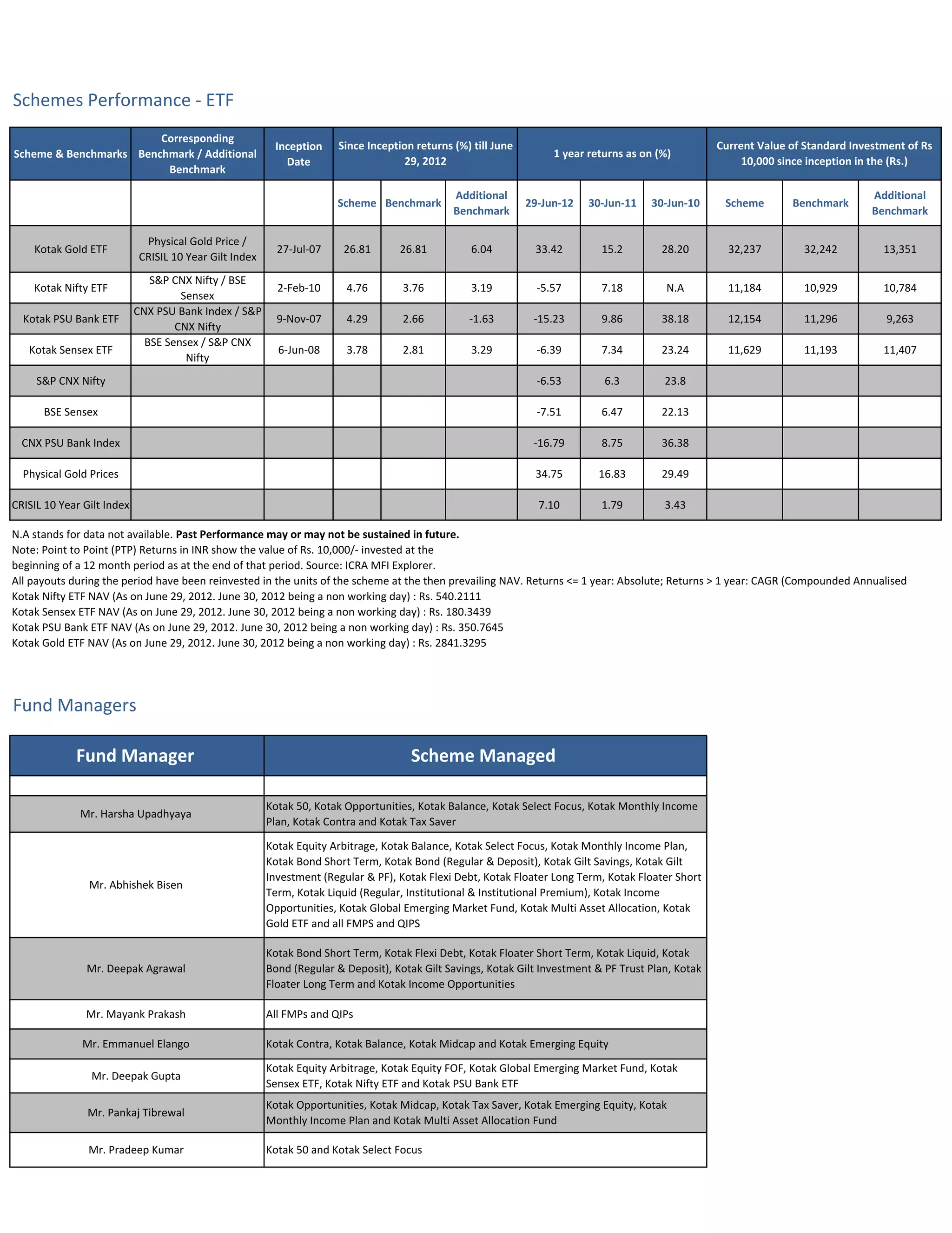 This document summarizes the performance of various Kotak Mutual Fund schemes as of June 29, 2012. It provides the inception date, returns since inception, 1 year returns as of June 29, 2012, and current value of a Rs. 10,000 investment made at inception for each scheme. It also lists the benchmark indices for each scheme and their returns. Finally, it provides details of the fund managers and the schemes each manages.