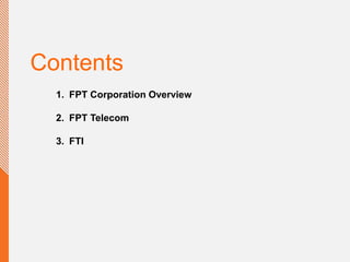 FPT Corporation is a leading Vietnamese information technology company with over 20,000 employees globally. It has a vision of becoming a leading global corporation in smart services. FPT Telecom International is a subsidiary of FPT that provides telecom services internationally, including data transmission, leased line internet, voice, and data center services. It has submarine and terrestrial cable connections across Asia to deliver high speed broadband and aims to be a one-stop shop for telecom solutions.