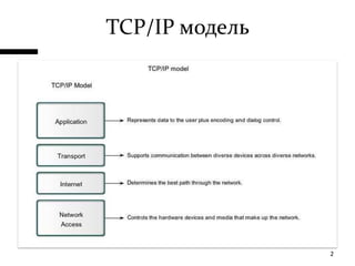 Документ описывает стек протоколов TCP/IP и его составляющие, включая протокол FTP, который обеспечивает передачу файлов по принципу 'клиент-сервер'. Указаны детали работы FTP, включая порты и процесс аутентификации, а также проблемы безопасности, такие как передача данных в открытом виде. Также рассматриваются преимущества и недостатки FTP по сравнению с другими протоколами, такими как HTTP и BitTorrent.