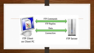FTP is a protocol that allows files to be transferred between computers connected to the Internet or with different operating systems. It uses two TCP ports, with port 21 for sending commands to the FTP server and port 20 for transferring data. The FTP server listens on port 21 for connections and commands from clients, then uses a separate data port to send and receive files and data.