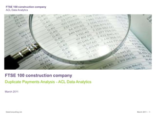 Dataconsulting was commissioned to develop ACL scripts for a construction company's accounts payable to mitigate the risk of duplicate payments due to data quality issues. The scripts utilize a fuzzy logic match on invoice details and filter false positives, becoming an effective monitoring control implemented twice a day. This solution has enhanced the client's payment process and reduced the occurrence of duplicate payments.