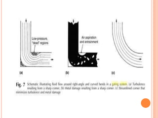 The document discusses elements of foundry technology related to gating systems and pouring equipment. It describes the key components of a gating system including the pouring basin, sprue, runner, and gates. It covers considerations for gating system design such as avoiding turbulence and promoting laminar flow. It also discusses the different types of pouring ladles used in foundries including hand ladles, shank ladles, tea pot ladles, bottom-poured ladles, and monorail ladles.