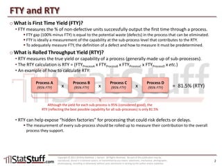 This document introduces First Time Yield (FTY) and Rolled Throughput Yield (RTY) metrics for measuring process performance. FTY assesses the percentage of non-defective units produced in a single process iteration, while RTY calculates the overall capability of a process made up of multiple sub-processes. The text includes practical applications for identifying and analyzing sub-process contributions to improve overall yield.