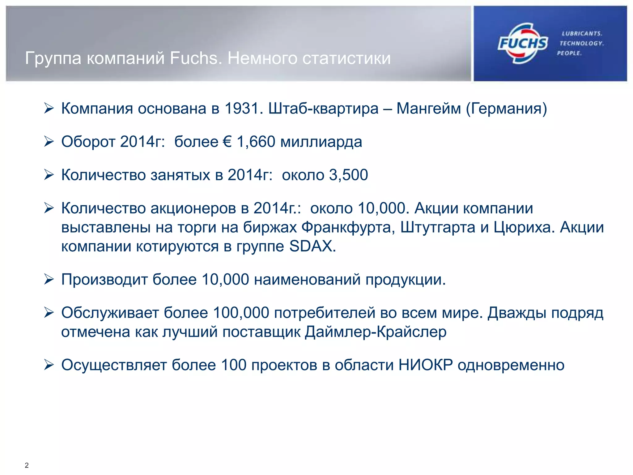 Компания Fuchs была основана в 1931 году и обслуживает более 100,000 клиентов по всему миру, производя свыше 10,000 наименований продукции. В России, ООО 'Фукс Ойл', основанное в 1990 году, имеет производственные мощности в Ярославле и сеть складов по всей стране. Компания также занимается мониторингом и управлением состоянием масел для обеспечения их качества и долговечности.