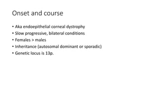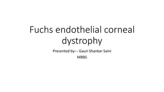 Fuchs endothelial corneal dystrophy is a slow progressive, bilateral eye condition that primarily affects females. It has four stages: corneal guttata, edema, bullous keratopathy, and scarring. The disease is characterized by a decrease in endothelial cell count and density over time. Early stages are asymptomatic, but later stages involve pain, decreased vision, and corneal scarring. Treatment options include lubricants, medications, and penetrating keratoplasty for advanced cases.