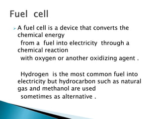 A fuel cell converts chemical energy from a fuel into electricity through a reaction with oxygen or another oxidizing agent. Hydrogen is commonly used as a fuel but other fuels like natural gas can also be used. Fuel cells provide continuous power as long as fuel is supplied, unlike batteries which have a limited storage capacity. They produce water, heat, and small amounts of pollution as byproducts. Individual fuel cells produce low voltages so they are stacked to increase output. Fuel cells have efficiencies between 40-85% and are used in various applications including transportation, backup power, and utilities.