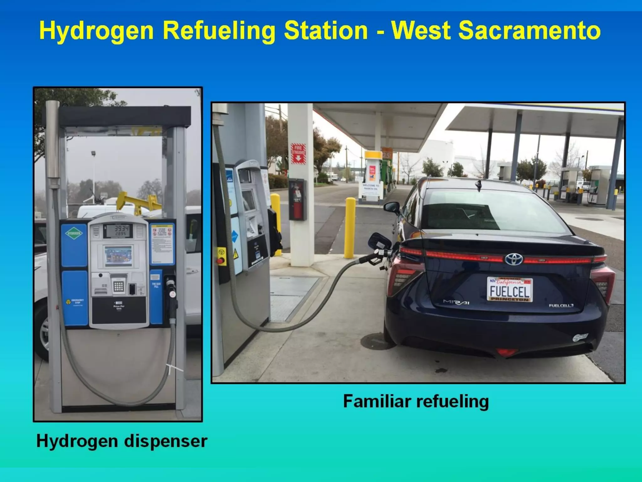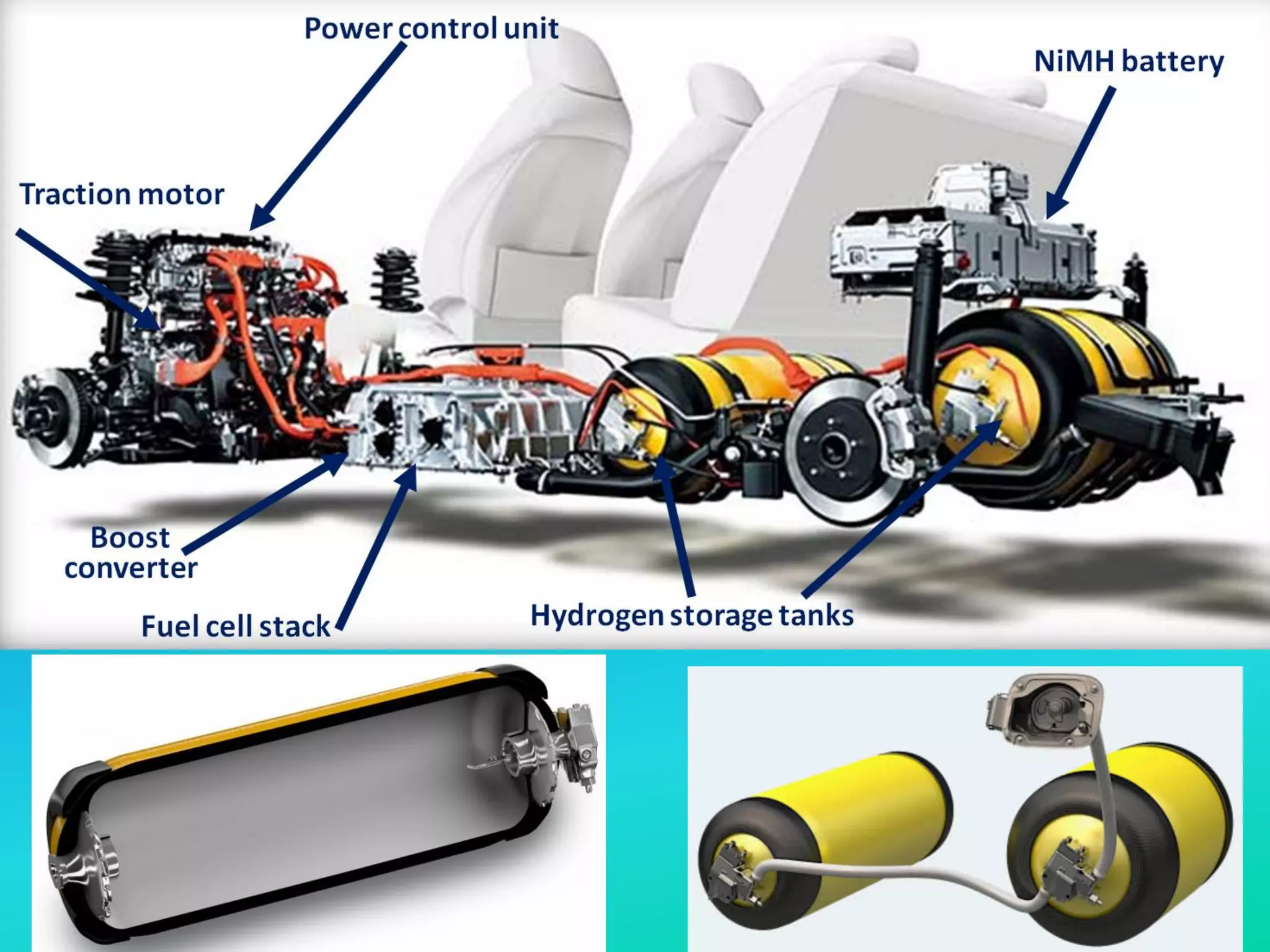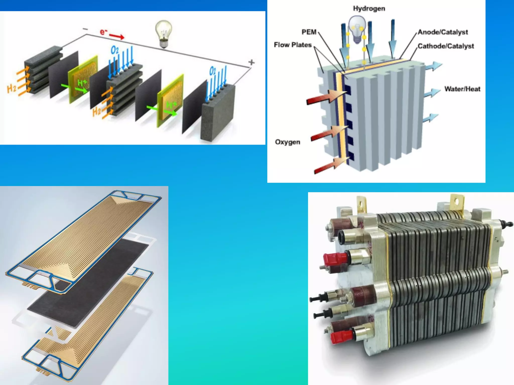 The document discusses fuel cell powered vehicles and hydrogen as a fuel. It provides information on the basic operation of a proton exchange membrane (PEM) fuel cell, comparing it to an internal combustion engine. PEM fuel cells produce electricity through an electrochemical reaction between hydrogen and oxygen, with water and heat as byproducts. The document outlines the key components of a PEM fuel cell and how ions and electrons are transferred to produce electricity. It also provides examples of advances in fuel cell vehicle technology over the past 28 years.