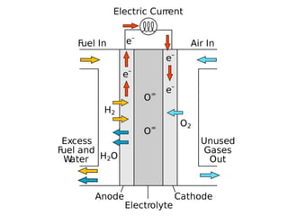 The document provides an in-depth overview of fuel cells, describing them as devices that convert chemical energy into electrical energy through electrochemical reactions between fuels like hydrogen and oxidizing agents. It categorizes various types of fuel cells, such as alkaline, phosphoric acid, and solid oxide fuel cells, detailing their working mechanisms, efficiencies, and applications in power generation and transport. The document also discusses regenerative fuel cells, which can reverse the chemical process to regenerate fuel, highlighting their potential in sustainable energy solutions.