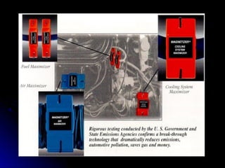 This document discusses hydrocarbon fuels and the role of fuel energizers. It notes that hydrocarbons leave carbon residue during combustion and do not combust until vapourized. This leads to issues like pinging and reduced efficiency. Methane is a major constituent of natural gas and is an important hydrogen source, with most of its energy coming from hydrogen. Hydrogen exists in para and ortho states, with ortho being more reactive. Fuel energizers use neodymium magnets to produce strong magnetic fields, breaking up hydrocarbons to increase surface area and changing hydrogen states to improve combustion. They are installed on fuel lines to provide benefits like increased mileage and reduced emissions.