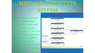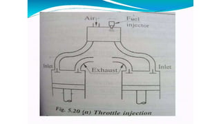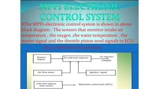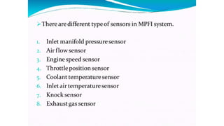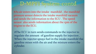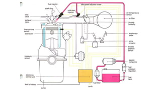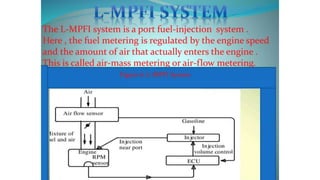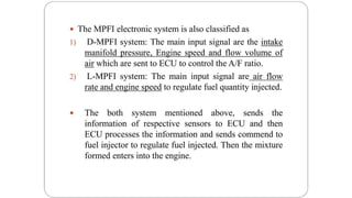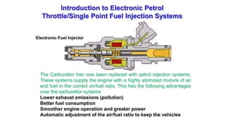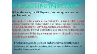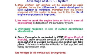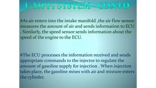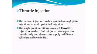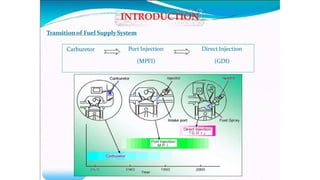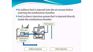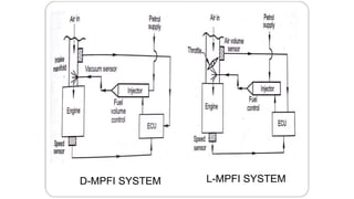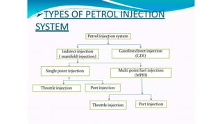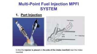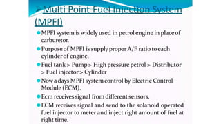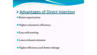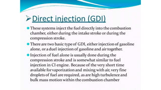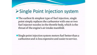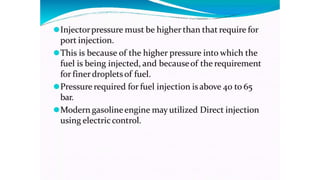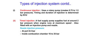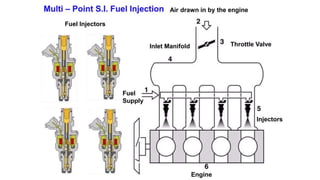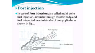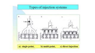 The document discusses fuel injection systems for spark ignition engines. It focuses on electronically controlled fuel injection which can precisely control the amount and timing of fuel injected into each cylinder. This allows for improved engine performance, fuel efficiency and reduced emissions.