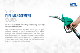 The Solution allows you to gain detailed visibility of your accumulated fuel costs, spillage and individual transactions. You can gain real-time insight into current fuel levels and operating efficiencies such as fuel economy and performance. The comprehensive reports help you cut fuel costs and improve your vehicle performance.
